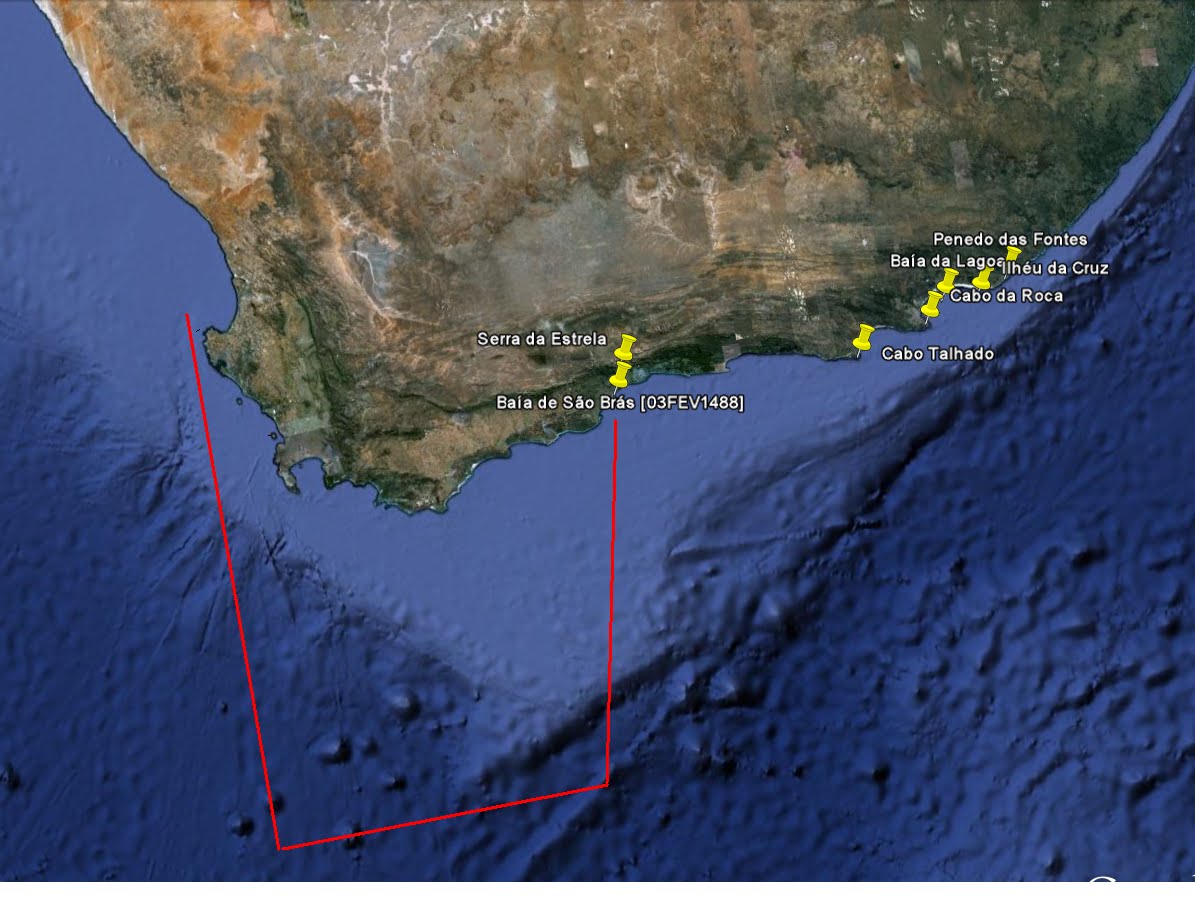 É impossível localizar a Praia das Aves, a Praia das Malhas e aEnseada Branca, mas o Golfo de Santa Maria da Conceição, baptizada a 8 de Dezembro, é provavelmente o Walvis Bay de hoje.